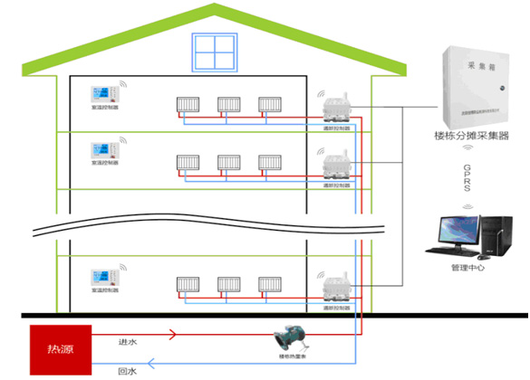 樓棟分攤采集器通過有線連接方式采集通斷控制器的閥門開啟時間,并將本棟樓各用戶的用量進行匯總、分攤、存儲,并通過以太網(wǎng)或GPRS/CDMA等通訊方式,發(fā)送至遠程供熱計量管理中心,從而實現(xiàn)了供熱分戶計量收費和管理。用戶也可以實時查詢供熱使用時間,使查詢更為人性化了。